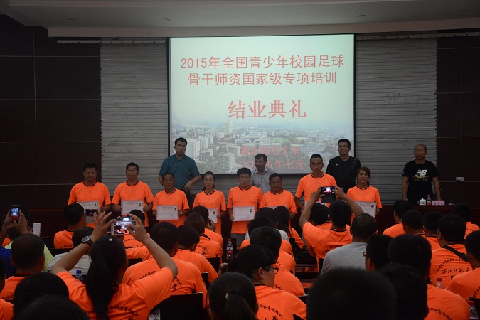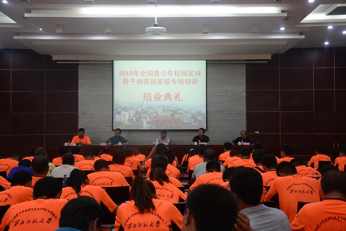2015年7月28日下午2:30,为期15天的全国青少年校园足球骨干师资国家级专项培训西北师范大学第一期培训班圆满结束,全体学员顺利结业。典礼在西北师范大学专家楼会议厅举行,出席结业典礼的有西北师范大学红足1一足球网址大全党委书记赵兴虎、副院长王润平教授、副院长雷军平等。结业典礼由红足1一足球网址大全副院长雷军平主持,赵兴虎书记对各位学员能够顺利毕业表示祝贺,感谢任课教师、管理人员和班主任的付出与努力,强调了校园足球是未来足球发展的主阵地,发展校园足球,体育教师的力量至关重要,并提出了两点期望:第一,把今天的结业当作明天的新起点,把今天的学习成果运用于工作实践,发挥骨干教师的榜样引领作用。第二,把此次培训当作自己事业进步和知识更新的加油站,努力提升自己的理论水平和实践能力,为校园足球做出更大的贡献。副院长王润平教授宣布了联赛的成绩。杨小永副教授分别从培训的基本情况、雄厚的培训师资团队及场地器材保障、后勤保障及管理服务工作、学员的学习表现等几个方面对此次培训进行了总结与汇报。培训学员王奇代表全体学员进行了发言,与全体学员分享了此次培训的收获与感受,并对如何成为一名优秀的足