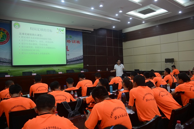 杨立老师生动的在给学员们讲解“我国校园足球发展的形势及有关政策的解读”