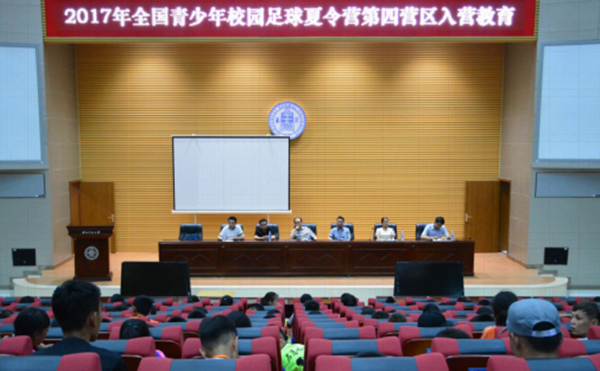 7月9日晚上19:30,2017年全国青少年校园足球夏令营(第四营区)在新校区毅然报告厅举行入营教育活动,组委会全体成员、各省自治区领队、教练员及全体营员参加了活动。