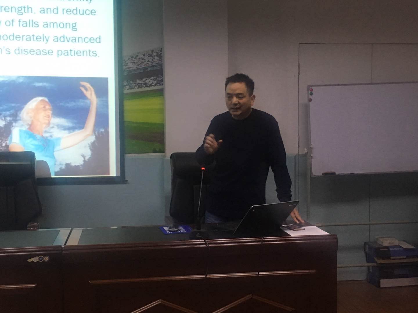 王老师向同学们介绍了帕金森病情的分级表、帕金森病情的危害性,展示了对比抗阻训练和拉伸训练,统计分析24周每周2次的运动干预,得出太极拳运动比抗阻训练和拉伸训练能有效提高轻到中度帕金森病人姿势稳定性和其他功能性结果,同时也对帕金森病人具有一定的安全性和有效性。