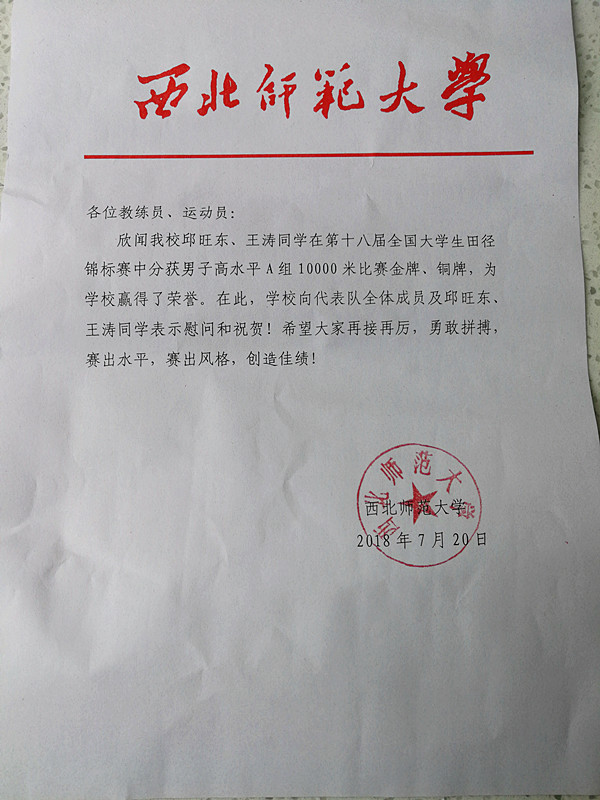 我校代表队在第十八届全国大学生田径锦标赛中取得优异成绩学校发来贺电