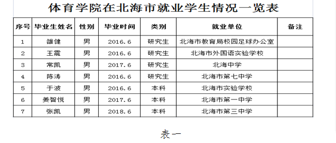1.经分析,2016—2018年,红足1一足球网址大全共有7名毕业生在北海市参加工作,其中研究生4人,本科生3人。2016年、2017年共有6人,2018年为1人。究其原因,前两年为教育局能够以人才引进方式解决正式编制,2018年暂为解决,故2018年人数比例有所下降(见表二)。