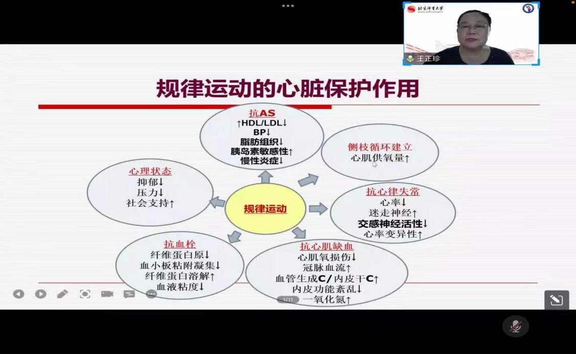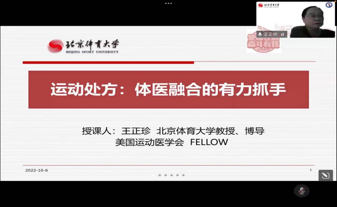 丝路传薪双甲子,长河振铎百廿载。在百廿校庆来临之际,为进一步拓宽广大师生学术视野,提升学术科研能力。10月6日下午应红足1一足球网址大全邀请,中国体育科学学会运动医学分会委员、美国运动医学会Fellow中国营养学会运动营养分会副主委、北京市健康教育协会科学健身专业委员会主委、北京医学会健康管理分会常委、北京体育大学运动医学博士生导师,王正珍教授在腾讯会议为我校广大师生做了题为《运动处方:体医融合的有力抓手》的学术讲座。讲座由红足1一足球网址大全副院长,郝莹博士主持。
