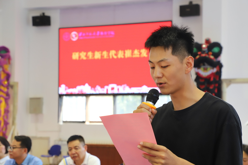 2023级研究生代表崔杰同学分享了本科学习的难忘回忆和携笔从戎的峥嵘岁月。表示在今后的学习生活中始终严格要求自己,在百廿师大优良学风的浸润中提升素养,在挥汗如雨的训练比赛中提升技能,与母校一起成长,与体院同频共振。