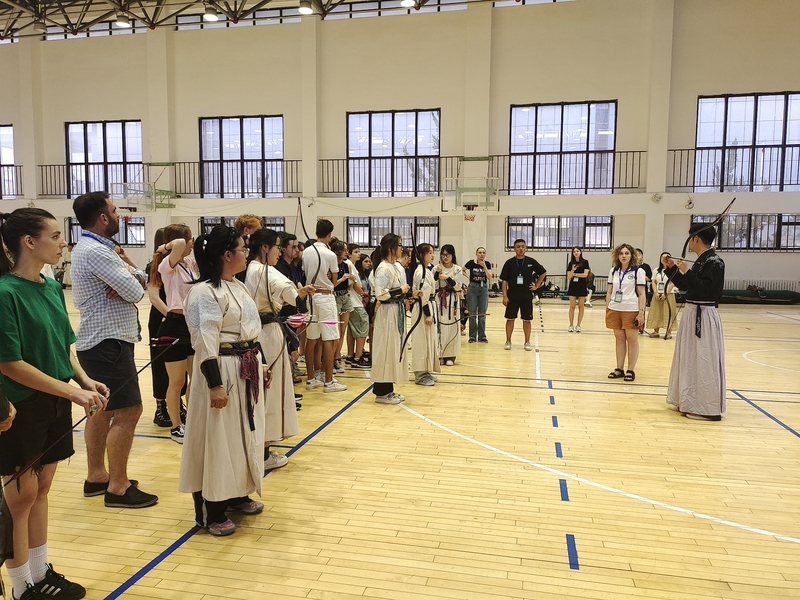 2024年7月3日,体育学院云亭校区体育馆气氛热烈,一场射箭表演吸引了所有人的目光。来自摩尔多瓦的访问团成员们,在这里见证了西北师范大学正己弓社成员们精湛的射艺表演,并亲自体验了这项古老的东方艺术。