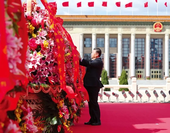2018年9月30日上午,党和国家领导人习近平、李克强、栗战书、汪洋、王沪宁、赵乐际、韩正、王岐山等来到北京天安门广场,出席烈士纪念日向人民英雄敬献花篮仪式。这是习近平整理花篮上的缎带。新华社记者 谢环驰/摄