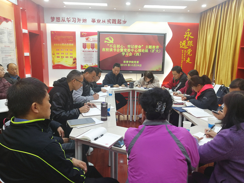 10月24日晚,学院党委在三楼党建活动室召开了第四次"不忘初心,牢记使命”主题教育夜校读书会暨党委理论学习中心组(扩大)学习会议。院班子成员、党委委员、党支部书记、各系部主任等20余人参加了会议,会议由陈仁伟院长主持。