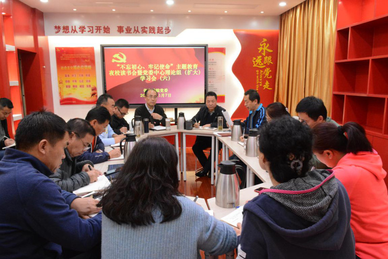 11月7日晚,学院党委在三楼党建活动室召开了第六次"不忘初心,牢记使命”主题教育夜校读书会暨党委理论学习中心组(扩大)学习会议。院班子成员、党委委员、党支部书记、各系部主任等20余人参加了会议,会议由赵卫东书记主持。