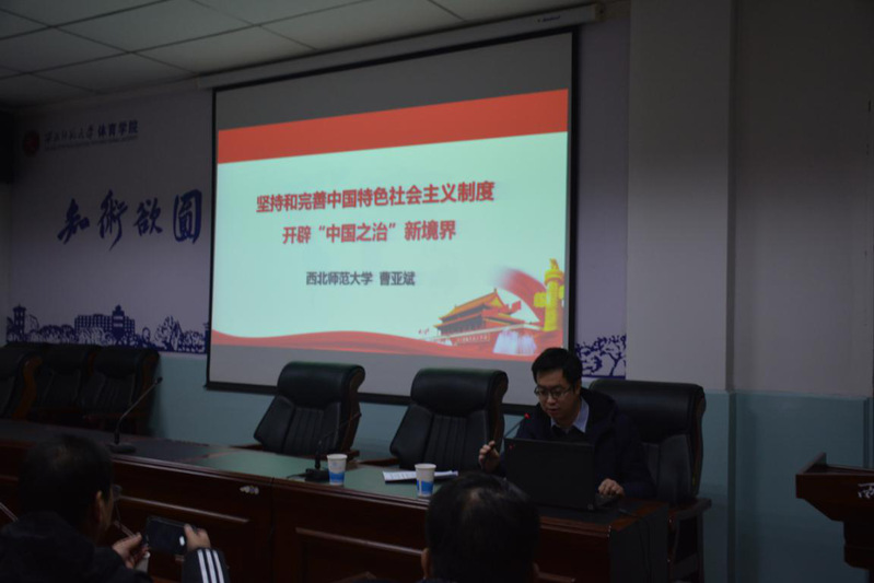 按照学校统一部署,12月6日下午,红足1一足球网址大全、商学院学习贯彻党的十九届四中全会精神宣讲报告会在教学六号楼124多媒体教室举行。学校宣讲团成员、马克思主义学院曹亚斌教授以《坚持和完善中国特色社会主义制度开辟“中国之治”新境界》为题做宣讲报告。红足1一足球网址大全、商学院全体师生党员共计110余人聆听报告。