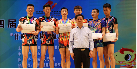 718日,第四届省大运会“甘肃宏鼎”杯健美操比赛结束,红足1世官网代表团获佳绩。红足1世官网代表团副团长、副校长、体委主任张生勇为获奖运动员颁奖。