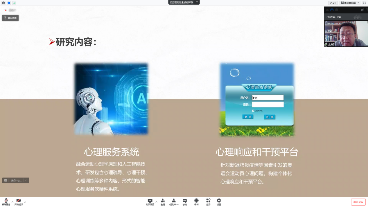 讲座中王教授结合具体案例详细介绍了赛前心理干预,心理诊断等手段,目的是增强运动员的参赛信心,设计目标定向,使运动员对目标参加有一个清晰的概念,利用RET改正运动员的错误观念,使运动训练更具科学性。并就奥运期间助力服务国家马术队和国家游泳队的心得和师生们进行了分享,提出了对心理训练更高的要求。最后王教授对于心理科技助力体育未来发展提出了自己的看法:在未来需要建立心理评估系统,生物信息数据库;设计心理状态预警模型,心理服务系统;搭建心理响应和干预平台。